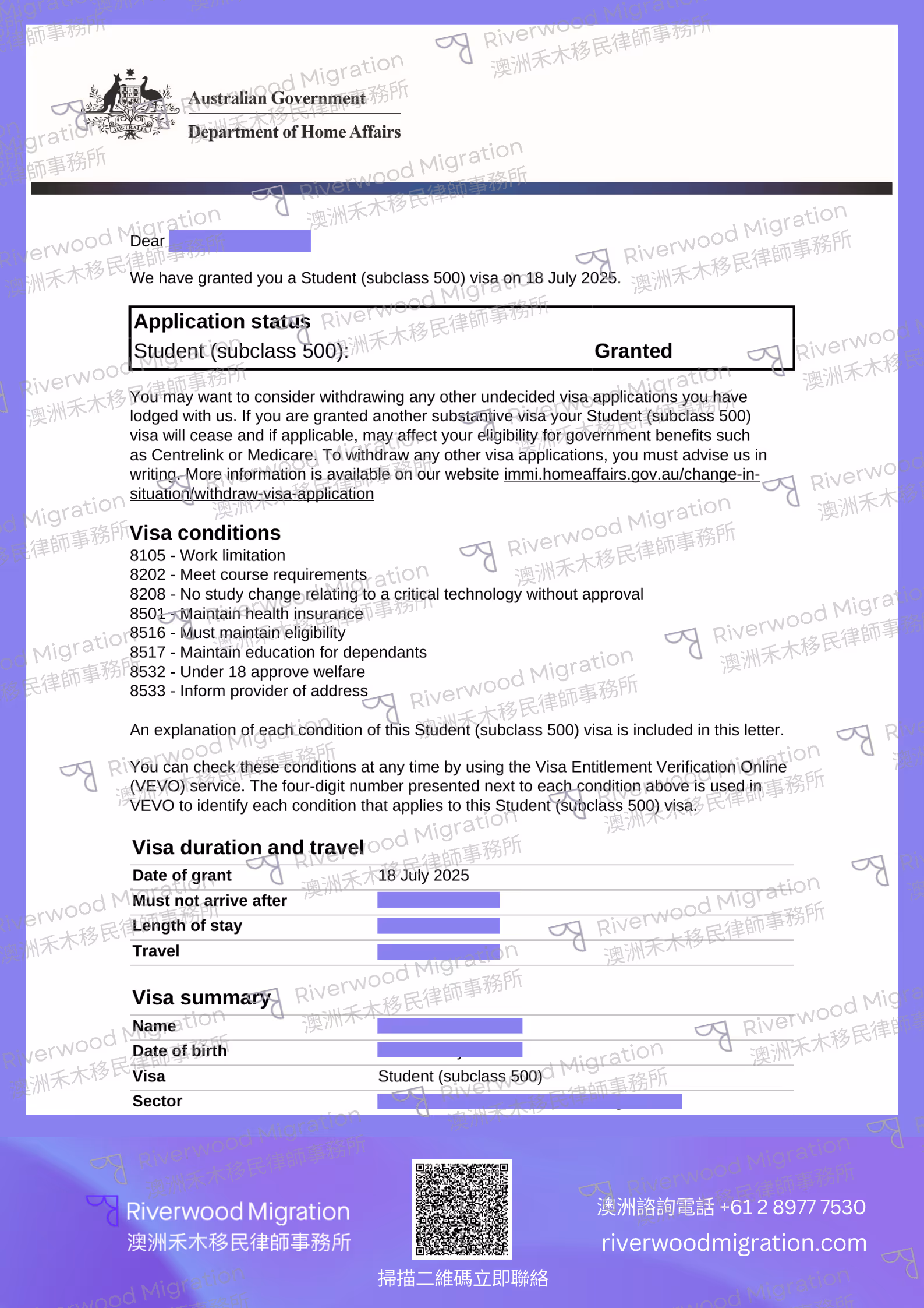 在我們的全程規劃下,客戶的學生簽證於遞交後 一個月內順利獲批,遠快於同類簽證 2–3 個月的標準審理時間,成功「逆風翻盤」。